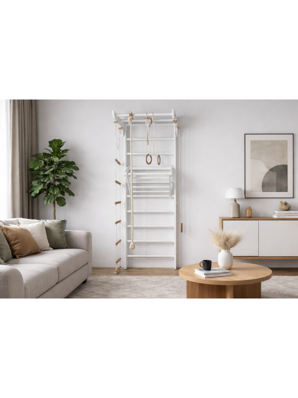 Iščete večnamensko športno opremo, ki bo navdušila otroke in obenem omogočila vadbo tudi odraslim? Naš lesen letvenik v elegantni beli barvi z dodatki je popolna rešitev za aktivno življenje doma – varen, kompakten in narejen iz kakovostnih naravnih materialov. Njegova svetla barva se odlično poda v vsak prostor in daje občutek svežine ter čistosti.