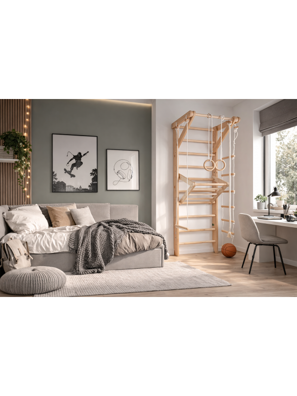 Iščete večnamensko vadbeno opremo, ki bo navdušila tako otroke kot odrasle? Naš letvenik z dodatki je odlična rešitev za aktivno preživljanje časa doma! Izdelan v Evropi iz visokokakovostnih naravnih materialov, ki zagotavljajo varnost in trajnost, ter zasnovan tako, da zavzame minimalno prostora – popoln za vsak dom!